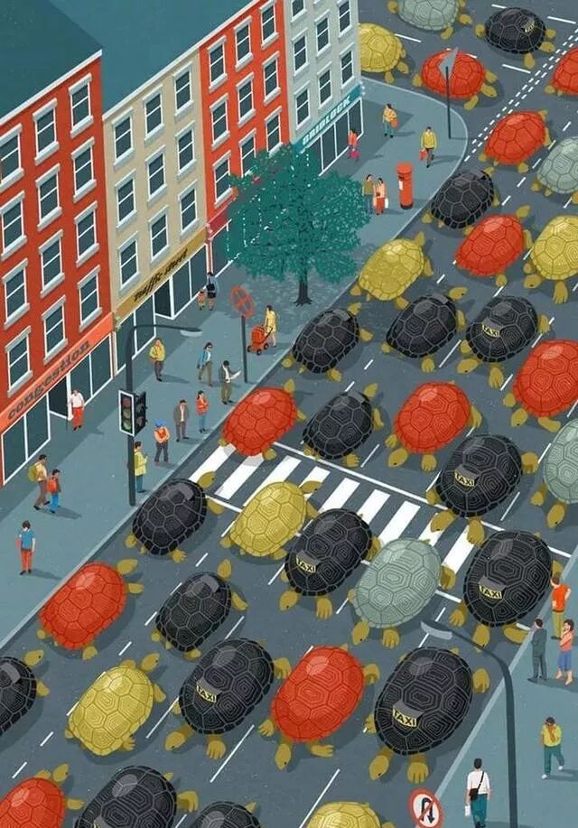 社会的进步,经济的快速发展,也加快了人们生活的节奏。从表象来看,人们似乎真的开始将“时间就是金钱”当做了一回事。然而生活的压力,急躁的社会风气,却致使原本可以走得更快的人,只能以更慢的速度前行。人们似乎已经忘记了什么叫做“一步一个脚印”,什么叫做遵守规则。正如插画里体现的那样,为了加快速度,人们变得比以往任何时候都要更慢。