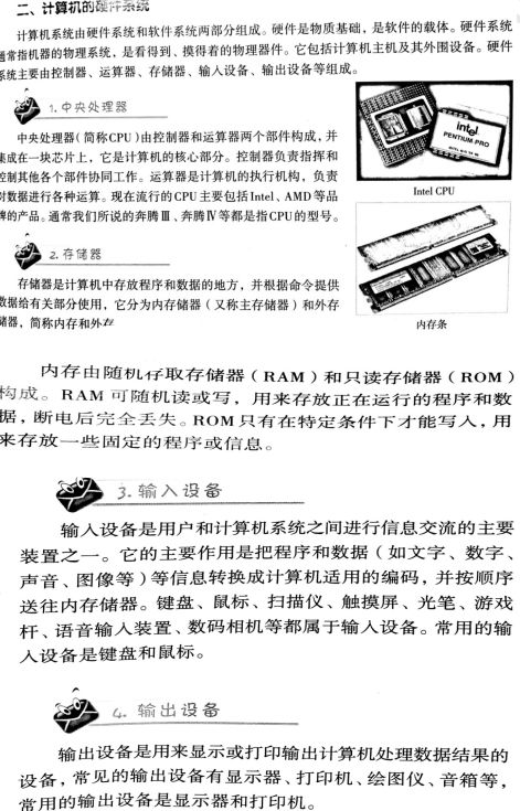 学生阅读课本自主学习输入输出设备,并请学生总结:输入设备是用户和计算机系统之间进行信息交流的主要装置之一,主要作用是把程序和数据等信息转换成计算机适用的编码,并按顺序送往内存储器;输出设备是用来显示或打印输出计算机处理数据结果的设备。